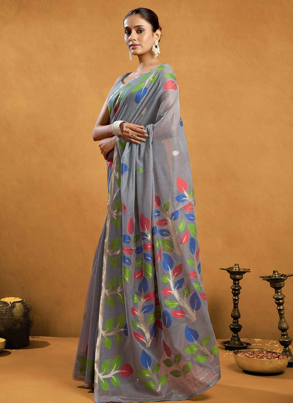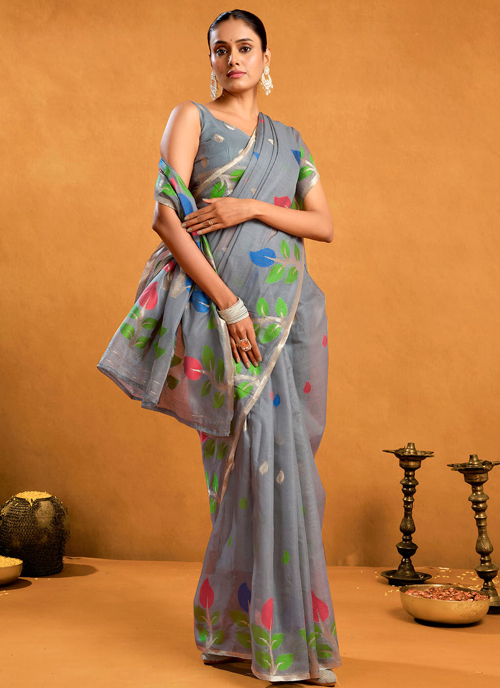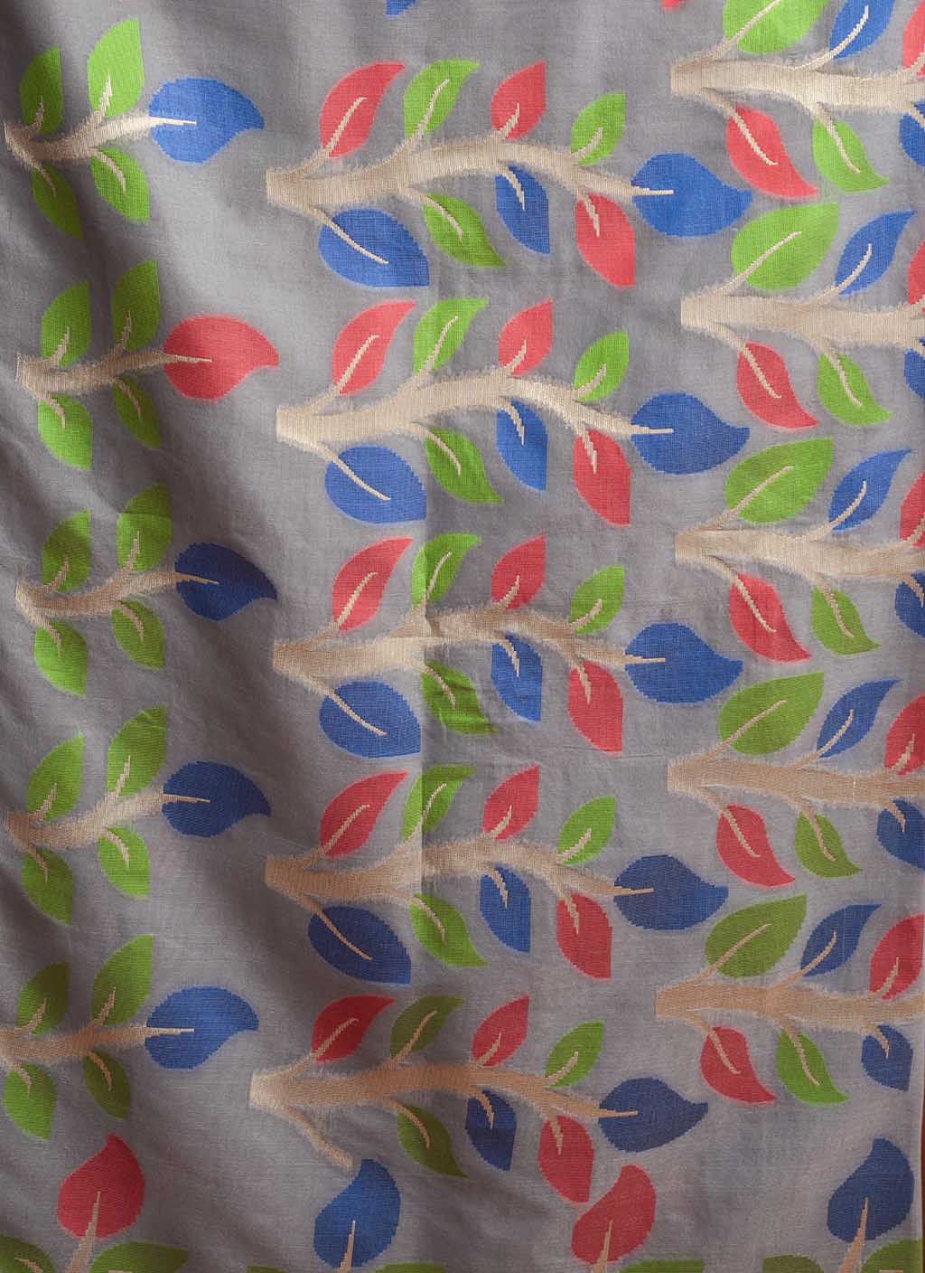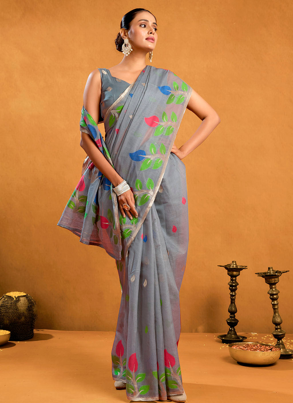 Saree Fabric : Pure Spun Cotton Jamdani Floral Weave Border & Pallu.